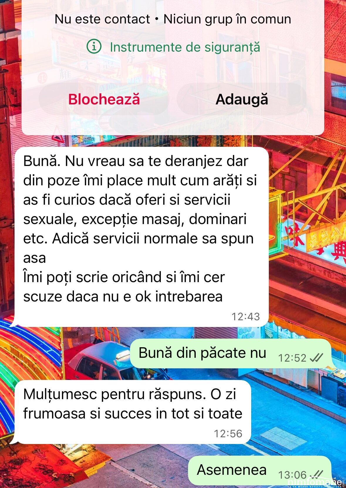 Noua in oraș fac și deplasări-0758 851 318-https://www.publi24.ro/anunturi/matrimoniale/escorte/anunt/noua-in-oras-fac-si-deplasari/70454gif08fd7215di4fi61435f08fe2.html Luat legatura cu ea prin mesaje,ea mi-a raspuns ,totul a decurs bine,mi-a dat adresa,ajuns in zona sun pentru confirmare,raspunde fata si incepe sa injure" de morți si raniti ca de ce o tot sunam"am inchis si dus am fost ,,mi-a raspuns apoi ca i pare rau dupa ce i-am reprosat ca nu se procedeaza asa ca poate sterge anuntul sau inchide telefonul(are solutii),concluziile le trageti voi..Va salut👋